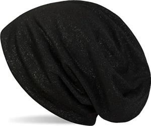 Damen Beanie Mütze mit All Over Glitzer in Unifarben, Glitzermütze, Leichte Stoffmütze Einfarbig 04024117, Farbe:Schwarz