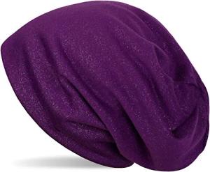 Damen Beanie Mütze mit All Over Glitzer in Unifarben, Glitzermütze, Leichte Stoffmütze Einfarbig 04024117, Farbe:Violett