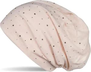 Damen Beanie Mütze mit edler Strass-Nieten Applikation, Longbeanie Slouch 04024037, Creme-Beige