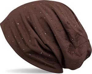 Damen Beanie Mütze mit edler Strass-Nieten Applikation, Longbeanie Slouch 04024037, Dunkelbraun
