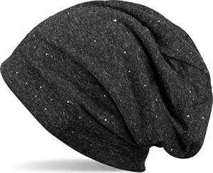 Damen Beanie Mütze mit edler Strass-Nieten Applikation, Longbeanie Slouch 04024037, Schwarz meliert/Used Look
