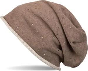 Damen Beanie Mütze mit edler Strass-Nieten Applikation, Longbeanie Slouch 04024037, Braun meliert/Used Look