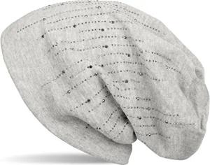 Damen Beanie Mütze mit Strass Nieten im edlen Streifen Design, Slouch Longbeanie, Stoffmütze Einfarbig 04024086, Farbe:Hellgrau meliert