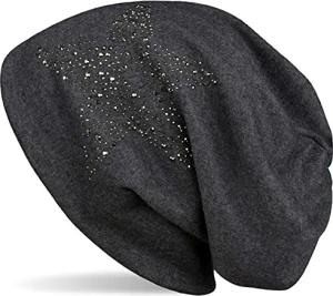 Damen Beanie Mütze mit edler Strass-Nieten Applikation, Longbeanie Slouch 04024037, Dunkelgrau