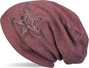 Damen Slouch Beanie Mütze mit Strass Stern | Glitzer Longbeanie aus weicher Viskose | One Size für Erwachsene, Farbe:Bordeaux-Rot meliert
