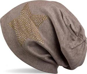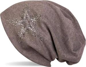 Damen Slouch Beanie Mütze mit Strass Stern | Glitzer Longbeanie aus weicher Viskose | One Size für Erwachsene, Farbe:Braun meliert