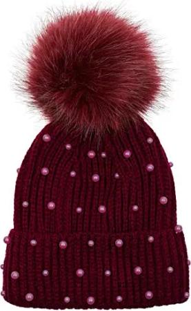 Damen Strick Bommelmütze mit Perlen und Fleece Futter, warme Winter Fellbommel Mütze, Fake Fur 04024155, Farbe:Bordeaux-Rot