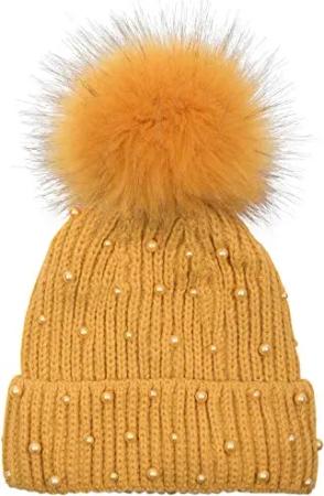 Damen Strick Bommelmütze mit Perlen und Fleece Futter, warme Winter Fellbommel Mütze, Fake Fur 04024155, Farbe:Curry