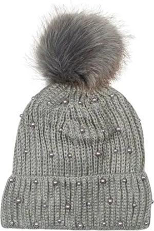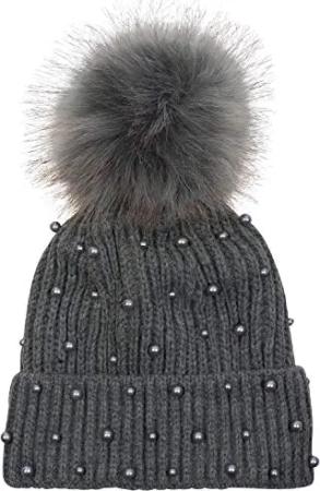 Damen Strick Bommelmütze mit Perlen und Fleece Futter, warme Winter Fellbommel Mütze, Fake Fur 04024155, Farbe:Grau