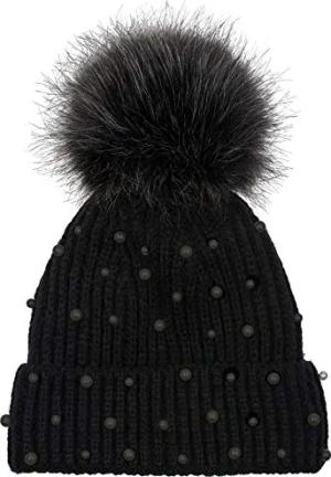 Damen Strick Bommelmütze mit Perlen und Fleece Futter, warme Winter Fellbommel Mütze, Fake Fur 04024155, Farbe:Schwarz
