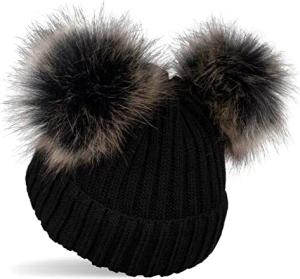 Kinder Strick Bommelmütze mit 2 Kunstfellbommel und Fleece Futter, Winter Mütze, Strickmütze, 2-5 Jahre 04024203, Farbe:Schwarz