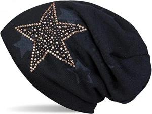 Klassische Unisex Beanie Mütze mit Stern Strass Applikation, warm 04024023, Farbe:Dunkelbraun/Dunkelbraun