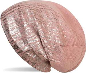 warme Feinstrick Beanie Mütze mit Metallic Print und Fleece Innenfutter, Slouch Longbeanie, Unisex 04024132, Farbe:Altrose/Rosegold