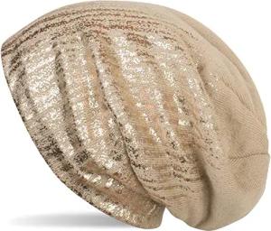 warme Feinstrick Beanie Mütze mit Metallic Print und Fleece Innenfutter, Slouch Longbeanie, Unisex 04024132, Farbe:Beige/Silber