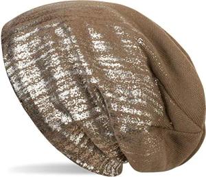 warme Feinstrick Beanie Mütze mit Metallic Print und Fleece Innenfutter, Slouch Longbeanie, Unisex 04024132, Farbe:Braun/Silber