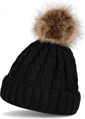 Zopfmuster Bommelmütze, Strickmütze mit Fellbommel, Winter Beanie Mütze, Unisex 04024064, Farbe:Schwarz