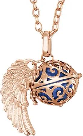 Halskette Damen roségold Edelstahl 70 cm mit roségoldenem Anhänger Engelsflügel und Klangkugel blau Ø 16 mm in Schmuckbeutel