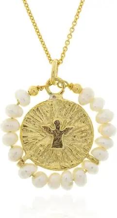 Perlmutt Halskette in vergoldetem 925 Sterling Silber mit 17 fancy Perlen aus China, eleganter runder Anhänger 22x20 mm, feine Kette 40-43 cm, edles Schmuckdesign