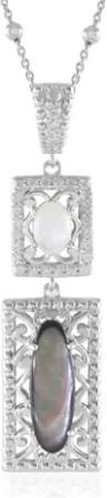 Perlmutt Silberkette mit 925 Sterling Silber, Ovaler Perlmutt- und Weißquarz-Cabochon, 1,33 ct Zirkonbesatz aus Kambodscha, eleganter filigraner Anhänger, 45,5-50,5 cm