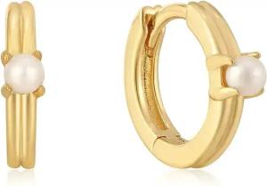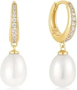Damen Creolen CHIC CREATOR Pavé Drop Huggies aus 925 Sterling Silber 14k vergoldet, verziert mit 20 Zirkonia und 2 Süßwasserperlen, Größe: 8,5 x 1,5~3 mm, inkl. Geschenkverpackung