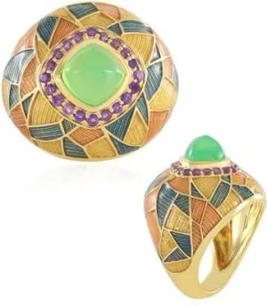 Grüner Chalzedon 2,7 ct Ring mit Amethysten 0,324 ct Vergoldeter 925 Silberring Elegant Modern Mosaik Design in Grün, handgefertigter Cocktail Schmuck