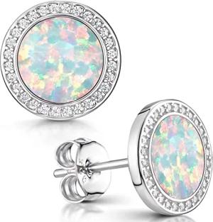 MATERIA Opal Ohrringe Silber 925 - Damen Ohrstecker weiß rund flach mit Zirkonia Steine in Schmuck Box SO-394-Opal