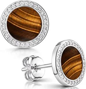 Materia Tigerauge Ohrringe Stecker rund - 925 Silber Ohrstecker Damen braun Glücksbringer Stein in Schmuck Box SO-394-Tiger