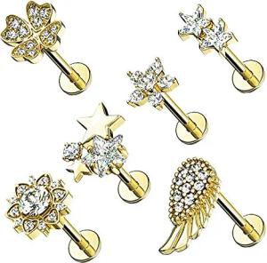 6er Set Piercing mit Glitzer Kristall Tragus Helix Ohr Cartilage Stab Labret Stecker Lippenpiercing Lippe Knorpel Gold 6mm