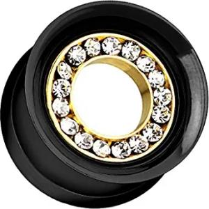 Flesh Tunnel Ohr Piercing Plug Ohrpiercing Double Flared Schwarz mit Kristall Inlay Gold 14mm Schwarz