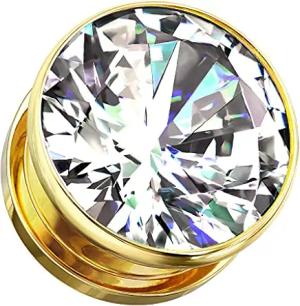Ohr Plug Edelstahl Flesh Tunnel Piercing Ohrpiercing Schraub Schraubverschluß mit großen klaren Kristall Stein 5mm Gold Clear