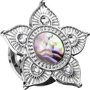Ohr Plug Flesh Tunnel Piercing Ohrpiercing Kunststoff Double Flared mit Motiv Weiß Perlmutt Blume 10mm