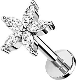 Piercing Stab mit Kristall Blume Lippe Ohr Labret Tragus Helix Knorpel Stecker Lippenpiercing Ohrpiercing 6mm Silber Clear