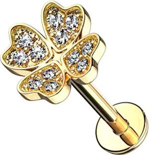 Piercing Stab mit Kristall Kleeblatt Lippe Ohr Labret Tragus Helix Knorpel Stecker Lippenpiercing Ohrpiercing Gold 8mm