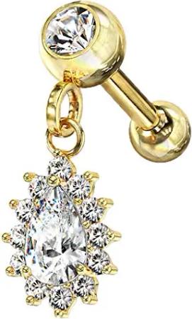 Piercing Stecker mit Glitzer Kristall Tropfen Anhänger Ohr Lippe Nasen Cartilage Tragus Helix Labret Nasenpiercing Gold Clear