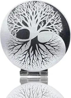 Echte Selenit Ladeplatte mit Gravur Yin-Yang und Baum des Lebens geschnitzt und poliert in Schwarz-weiß - Ø 10 cm - 250 Gramm - mit kleinem Acrylständer - zum Aufladen von Edelsteinen