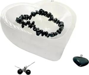 - Echtes Obsidian Edelstein Schmuckset mit hochwertiger Selenit Herzschale 10cm | für die Liebsten | Chakrasteine | Heilsteine | 4-teilig