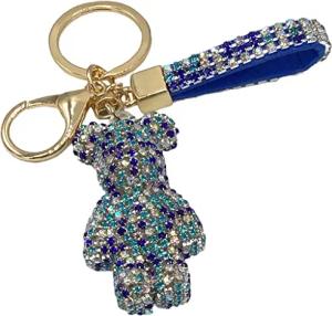 Edler Glitzerbär Schlüsselanhänger mit Ring und Lederschlaufe | luxuriöses Geschenk | Cartoon | Strass (Blau)