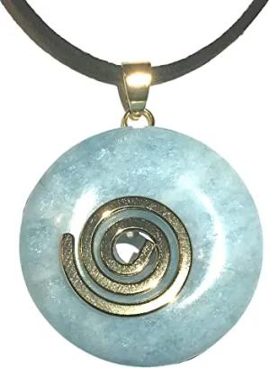 - Premium Aquamarin blau Donut optional als Kette mit Silber- oder Goldanhänger und 80cm Lederband | Heilstein | Edelstein | Chakra-Stein (Donut mit Silberspirale und Wildlederband)