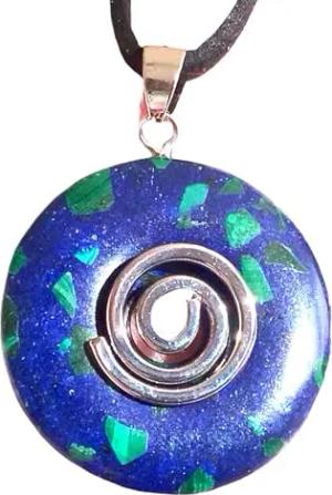 - Premium Azurit-Malachit Donut synth. optional als Kette mit Silber- oder Goldanhänger und 80cm Lederband | Heilstein | Edelstein | Chakra-Stein (Donut mit Band und versilberter Spirale)