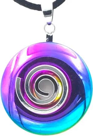 - Premium Regenbogen-Hämatit Donut optional als Kette mit Silber- oder Goldanhänger und 80cm Lederband | Heilstein | Edelstein | Chakra-Stein (Donut mit Silberspirale)
