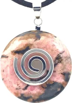 - Premium Rhodonit Donut optional als Kette mit Silber- oder Goldanhänger und 80cm Lederband | Heilstein | Edelstein | Chakra-Stein (Donut mit Silberspirale)
