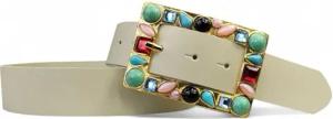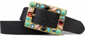 Damen Ledergürtel Rindsleder ca. 4 cm breit 2-3 mm dünn goldene Schnalle 10x6 cm mit bunten Steinen Druckknopf wechselbar Größen 85-125 sommerlich für Kleid und Hose