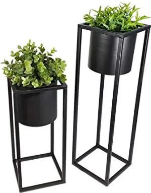 Metall Blumentopfständer in schwarz 2er Set - Eckiger Ständer mit schwarzem, rundem Topf - 35 und 50 cm - Blumentopfhalter mit Topf - Planzenständer eckig
