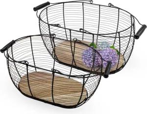 Metall Gitterkorb schwarz mit Holzboden 2er Set - 40 und 34 cm - Deko Drahtkorb mit Tragegriffen aus Holz - Korbset Dekokorb Aufbewahrungskorb Metallkorb Gitter Design oval