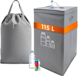 Pfandflaschen Sammelbehälter mit entnehmbarer Tragetasche - 115 L - Pfandflaschensammler mit Deckel und Tragegriffen - Flaschensammler Flaschenbehälter Getränkedosen Pfandsammler für 30-45 Flaschen