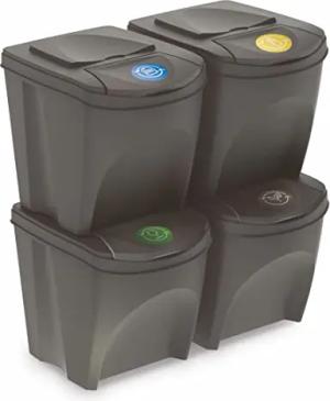 Sortibox Mülleimer mit Deckel 25 L - 4er Set/steingrau - Stapelbares Müll Trennsystem - Abfall Sortierer Trenner Sytem Trennkörbe stapelbar mit Klappe