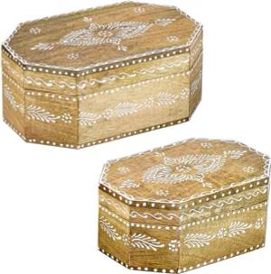 Marrakesch 2er Set Aufbewahrungsbox mit Deckel aus Holz 20 & 15cm groß | Boho Deko Schmuckkästchen Hajdar -1- zur Schmuckaufbewahrung | Massive Holzbox Ideal als Geschenkbox Geschenke für Frauen