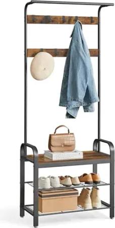 Garderobenständer mit Sitzbank, Kleiderständer mit Haken, Schuhregal, Garderobe mit Tragetasche, Jackenständer für Eingangsbereich, Flur, Stahl, Rustikal-Braun