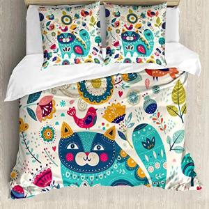 Katze Bettbezug Set, Katze mit Vögeln, Milbensicher Allergiker geeignet mit Kissenbezügen, 200 cm x 200 cm - 80 x 80 cm, Mehrfarbig