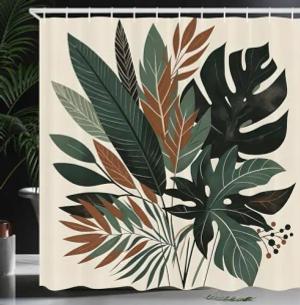 Monstera Duschvorhang, Abstrakte Boho Tropische Blätter Palme Banane Olive EIN Tanz der Natur, Stoffliches Gewebe Badezimmerdekorationsset mit Haken, 175 x 200 cm, Salbeigrün Fawn Evergreen